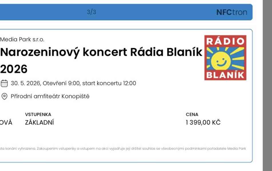 Prodám 3 vstupenky na koncert rádia Blaník 30.5. 2026 na Konopišti. Uvedená cena je za jeden kus, možno koupit jednotlivě.