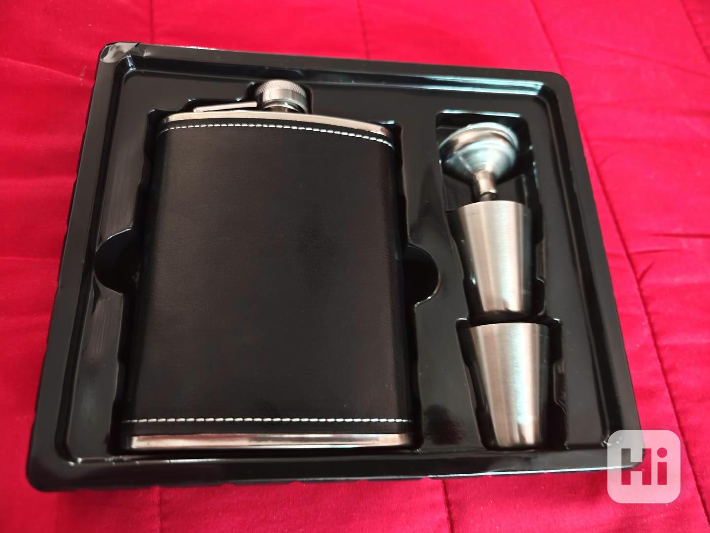 dárková sada placatka - materiál ocel potažená kůží a 2 panáky+trchtířek - materiál ocel.